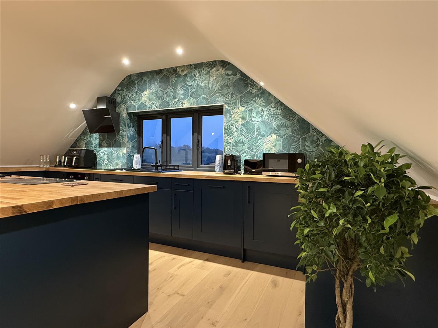 A fully heated, newly built eight car garage block with two bedroom, two bathroom lodge above and a south facing deck with open views and planning permission granted to erect a stable block.